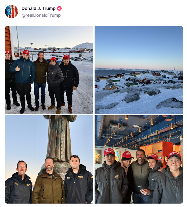 特朗普之子小唐纳德·特朗普当天到访格陵兰岛。小唐纳德·特朗普表示,此次行程为私人旅游。特朗普在社交媒体上写道:“小唐纳德和我的代表们已抵达格陵兰岛,受到了热烈欢迎……(美国对格陵兰岛的控制)是一笔必须发生的交易。让美国再次伟大,让格陵兰岛再次伟大!”
