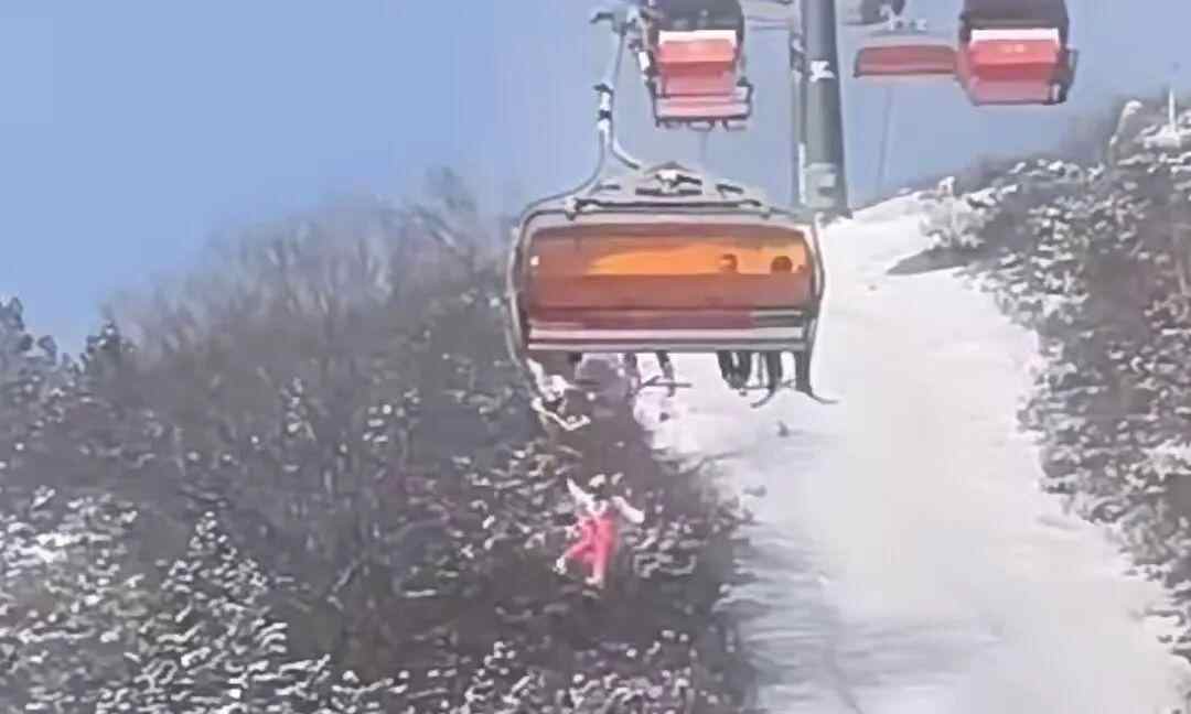 1月8日,网传河北张家口云顶滑雪场有游客从缆车坠落。在视频中可以看到,一辆缆车正在前进,一名身着滑雪服的乘客悬在空中,十分危险,旁边有人尽力拉住,但该乘客仍在几秒后坠落,视频拍摄者表示“下面有树”。