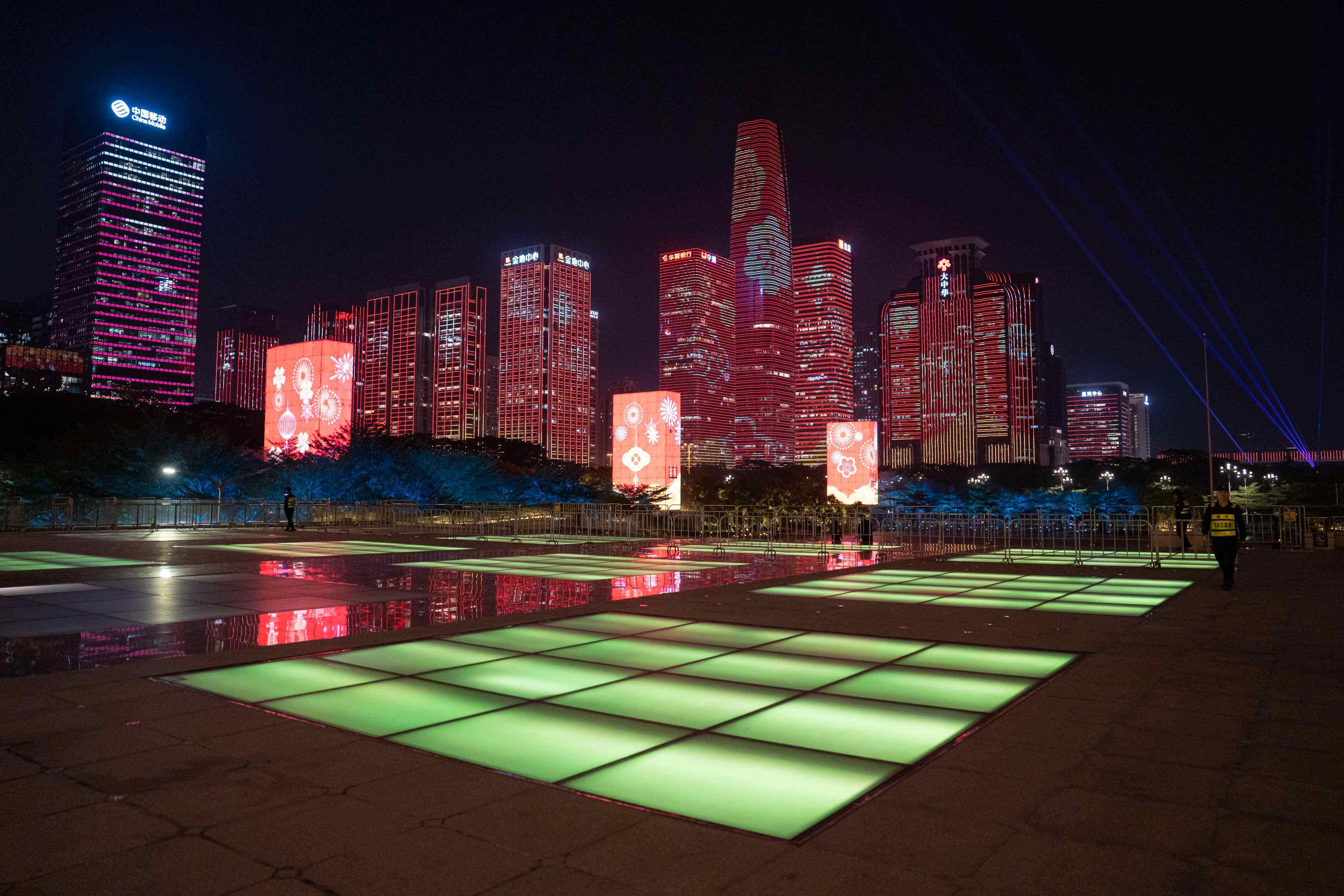 活动高潮部分,深圳市福田区市民中心周边43栋楼宇及其公共空间上演了一场主题为“请到广东过大年”与“辉煌新时代”的主题灯光秀。灯光秀以“请到广东过大年”的宣传标语为开篇,向海内外游客发出诚挚邀请。与此同时,千架无人机如繁星般在深圳夜空中编排出“请到广东过大年”“来深过大年、圳好遇见你”,以深圳独有的科技魅力,为这场文旅盛宴增添一抹亮丽的色彩。