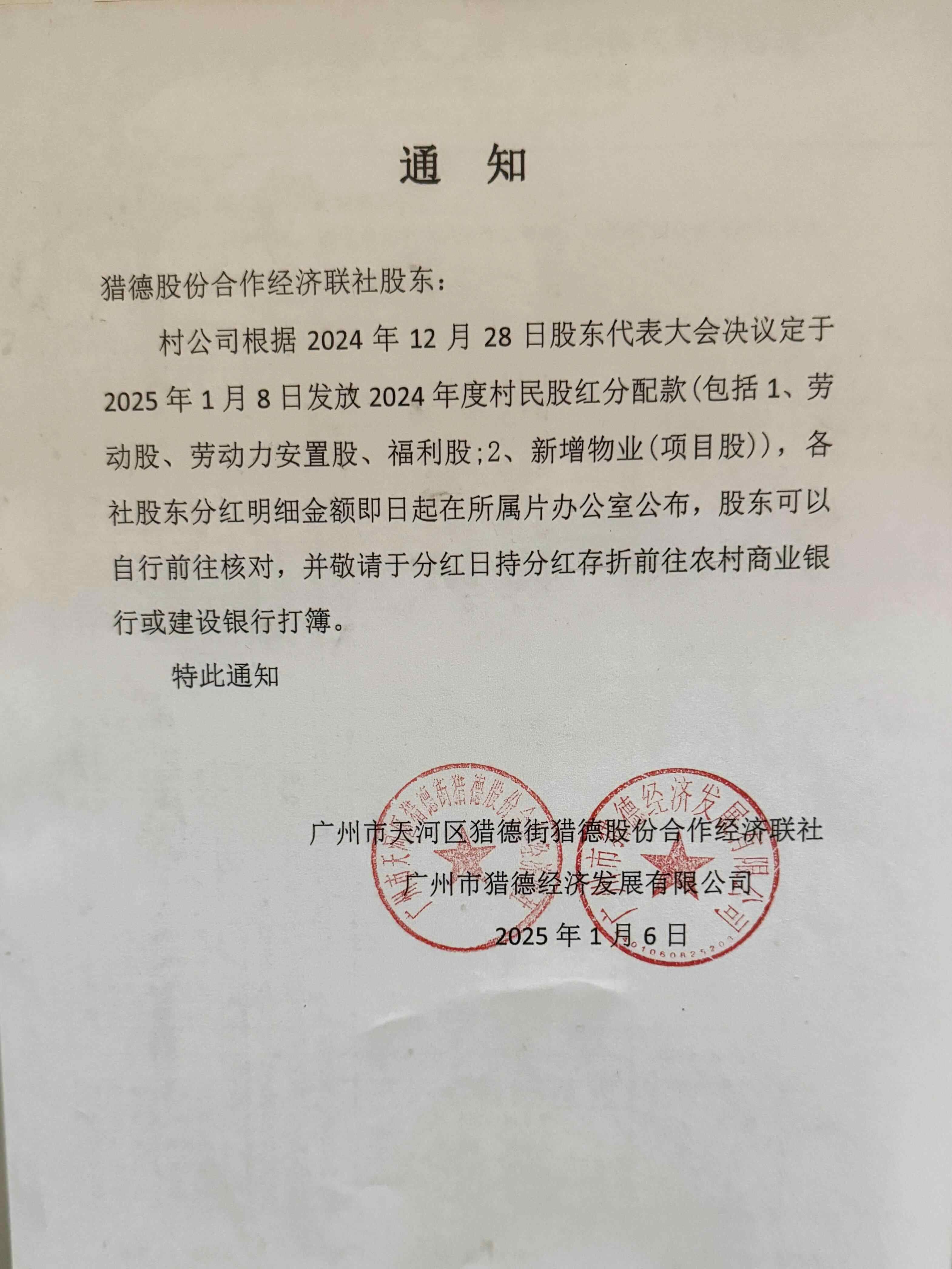 记者在猎德村实地走访时看到,村内确实张贴了白底黑字的通知,与网上疯传的通知照片一致。该通知由广州市天河区猎德街猎德股份合作经济联社、广州市猎德经济发展有限公司发布,明确村公司根据2024年12月28日股东代表大会决议,定于2025年1月8日发放2024年度村民股红分配款,分红包括两项:一是劳动股、劳动力安置股、福利股;二是新增物业(项目股)。