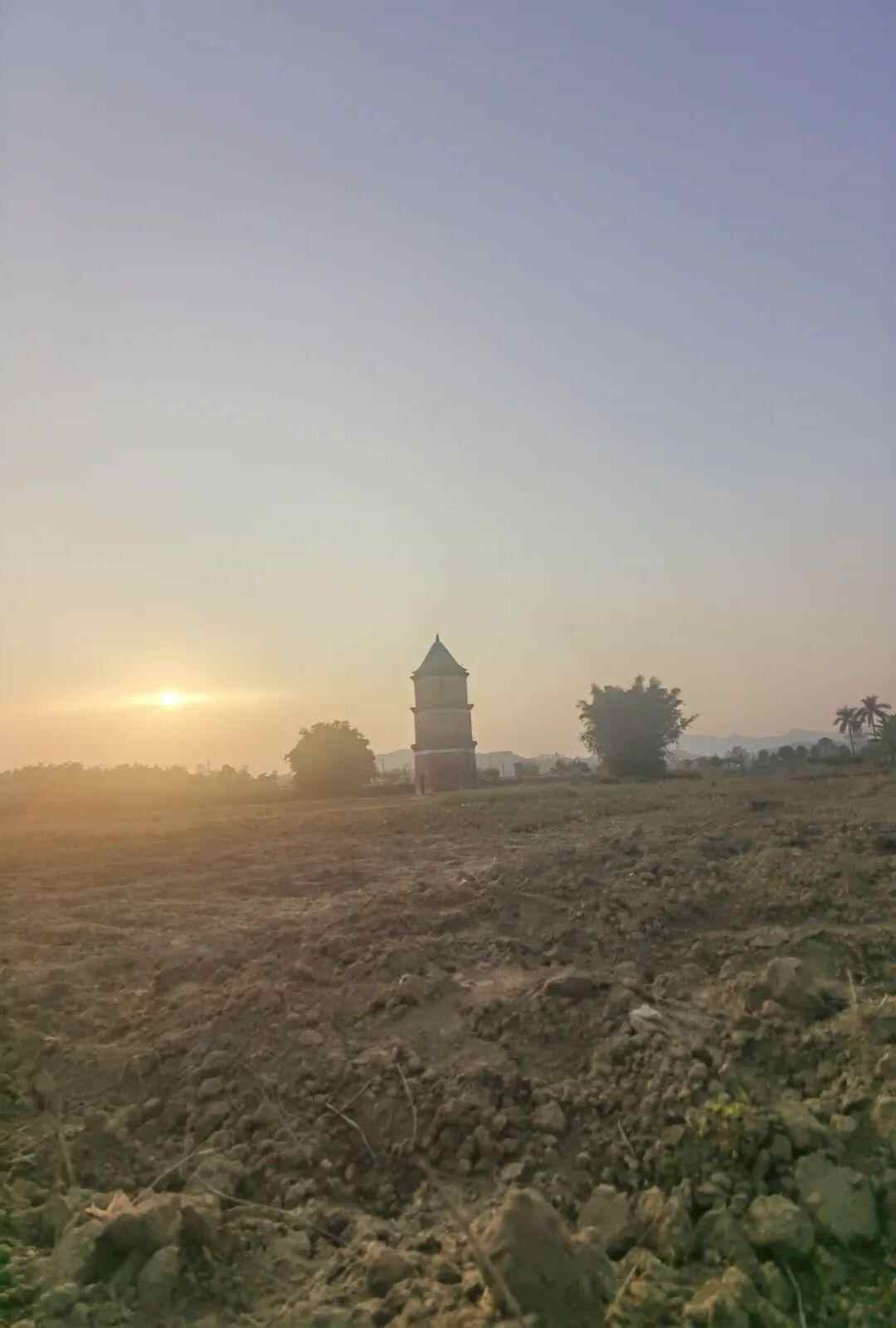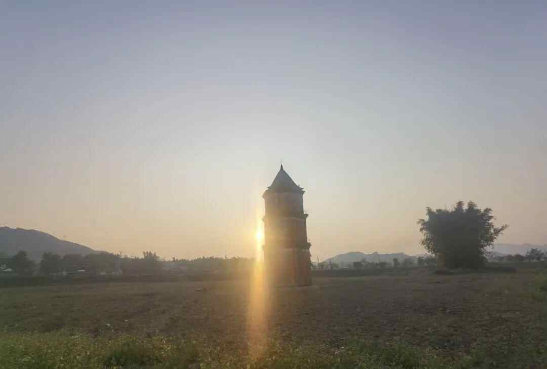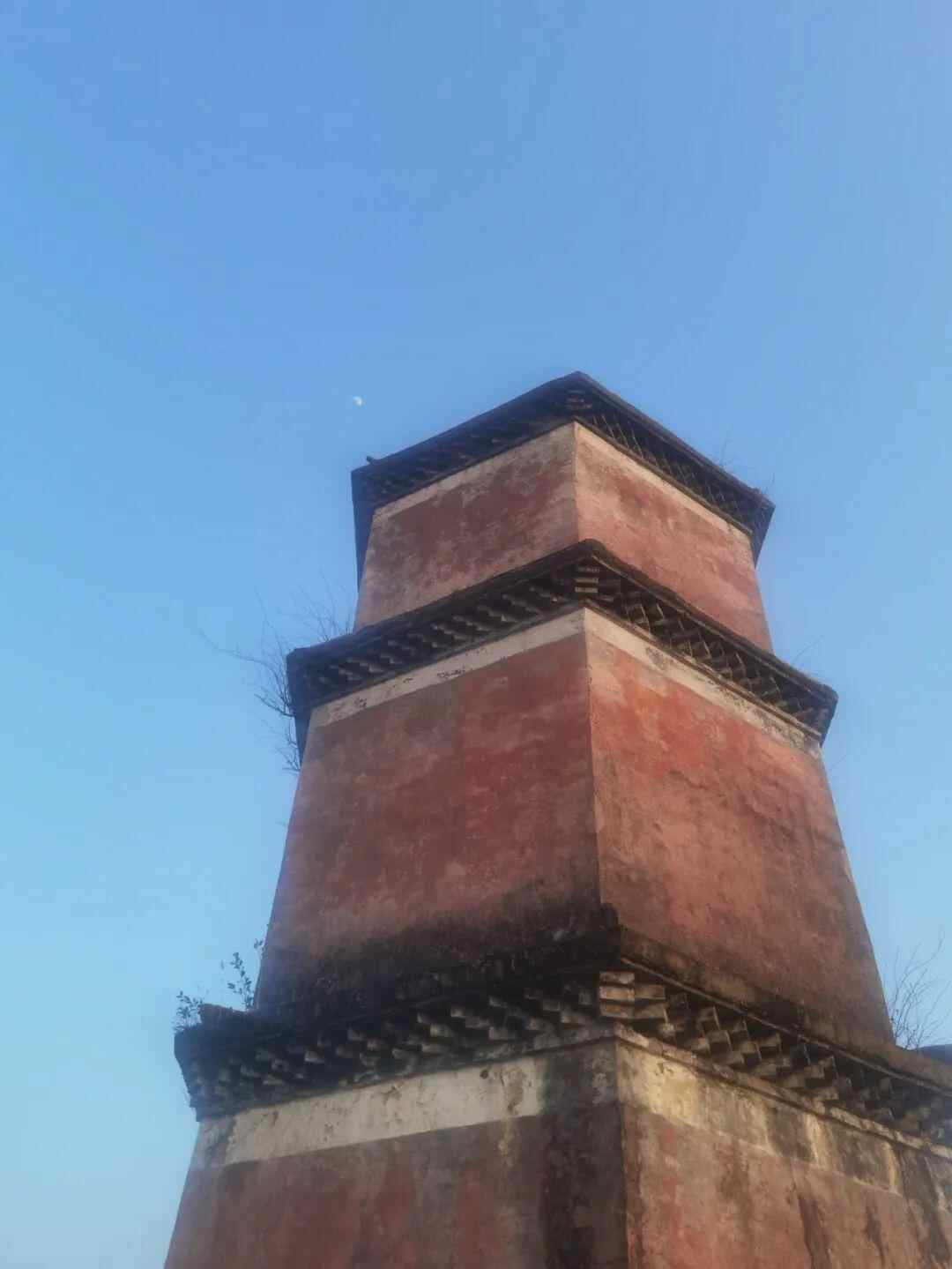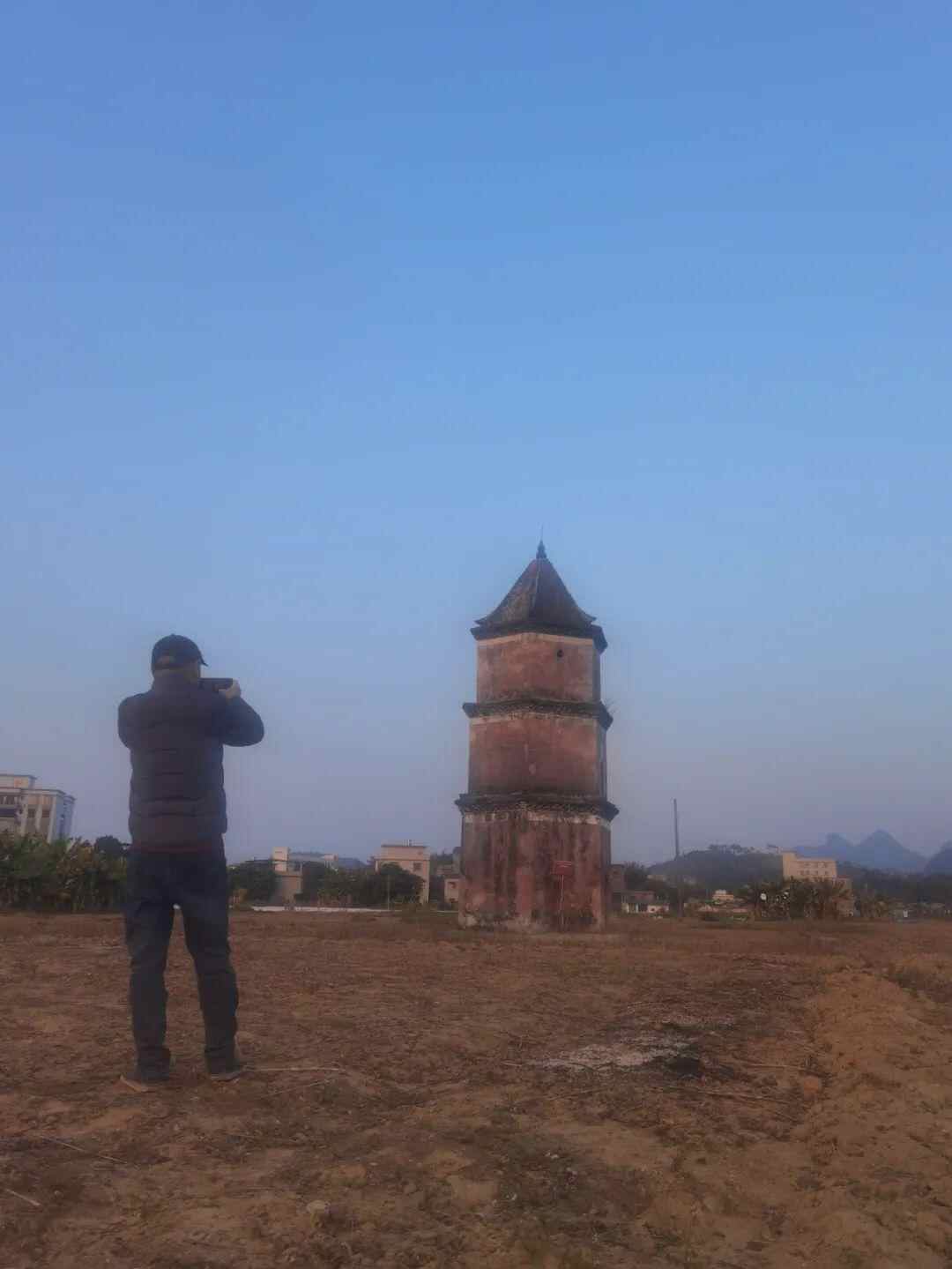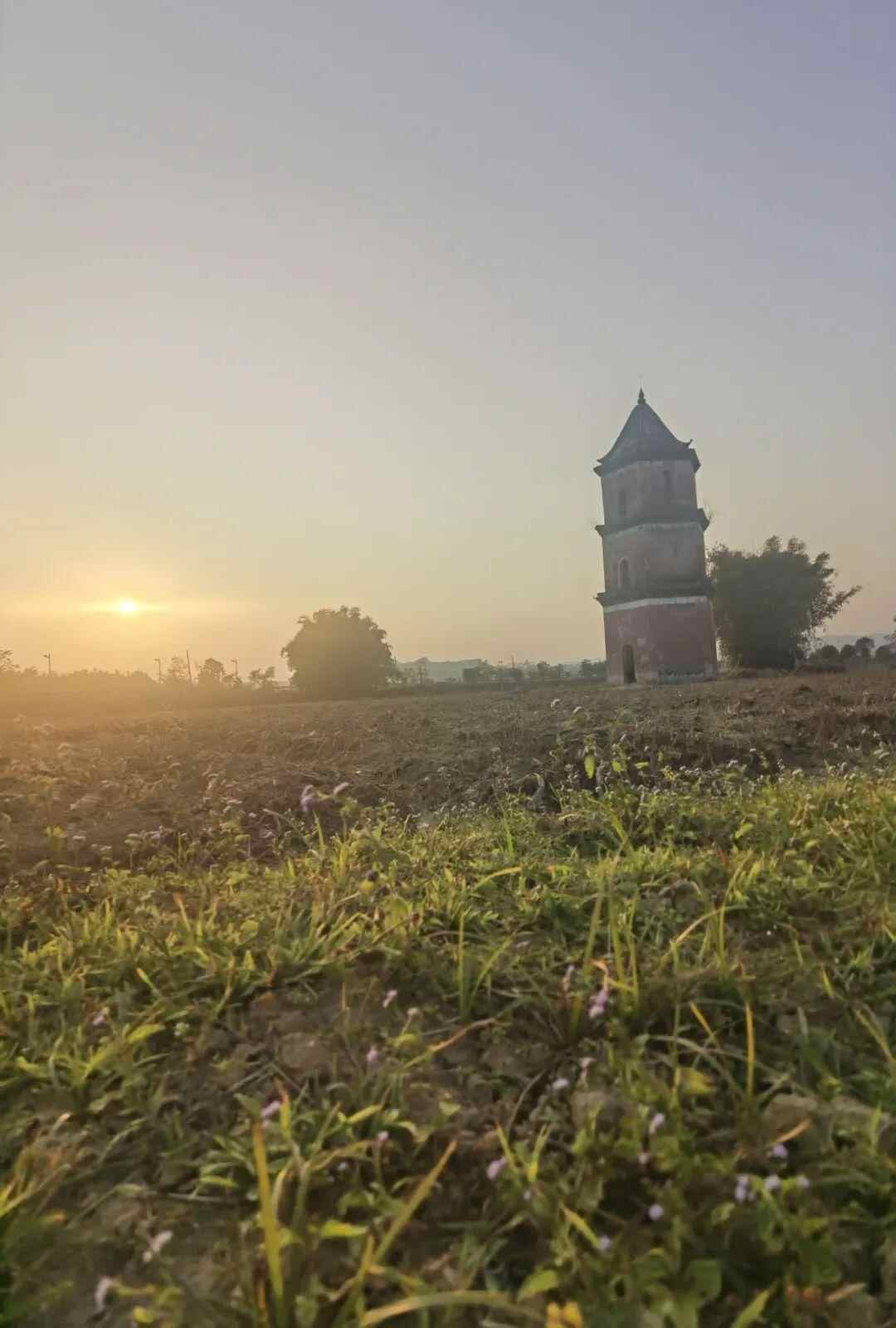 刚入联群村,就发现前面远远的有一座古塔,三层,像一支笔,陈德道说这就是文昌塔。我说怎么回事,来了那么多次,都没发现这个好家伙。车一停下,马上赶过去,和张伟、何枫他们到得时,天空澄澈。周围是一片平整的田野,花生收割多时,土地裸露,中间就矗立着这么一个古塔,不高,但造型雅致、利索,塔身周围的红色,因为历史长了,特别古雅。我入其内,上三楼,陈德道在下面给我拍了张照片。时夕阳西下,把古塔的影子拉到天边。