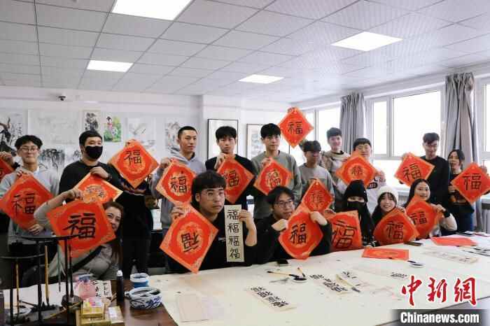 在新疆大学开设的公共艺术选修课上,书法老师向两地青年教授了“福”字的多种写法,大家纷纷拿起毛笔,在四方红纸上写下大大的“福”字,向彼此送上新春祝福。