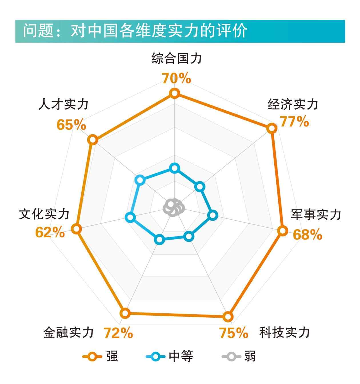 调查数据显示,中国的综合国力及各项实力被国外受访民众普遍评价为“强”。经济实力强获认可比例最高,达77%;其次为科技实力(75%)和金融实力(72%)。年轻群体对中国科技实力的评价更高。非洲国家、金砖国家、中东国家、发展中国家有超过七成民众认为中国综合国力强;该比例在东盟国家和欧洲国家超过六成,在发达国家超过半数。