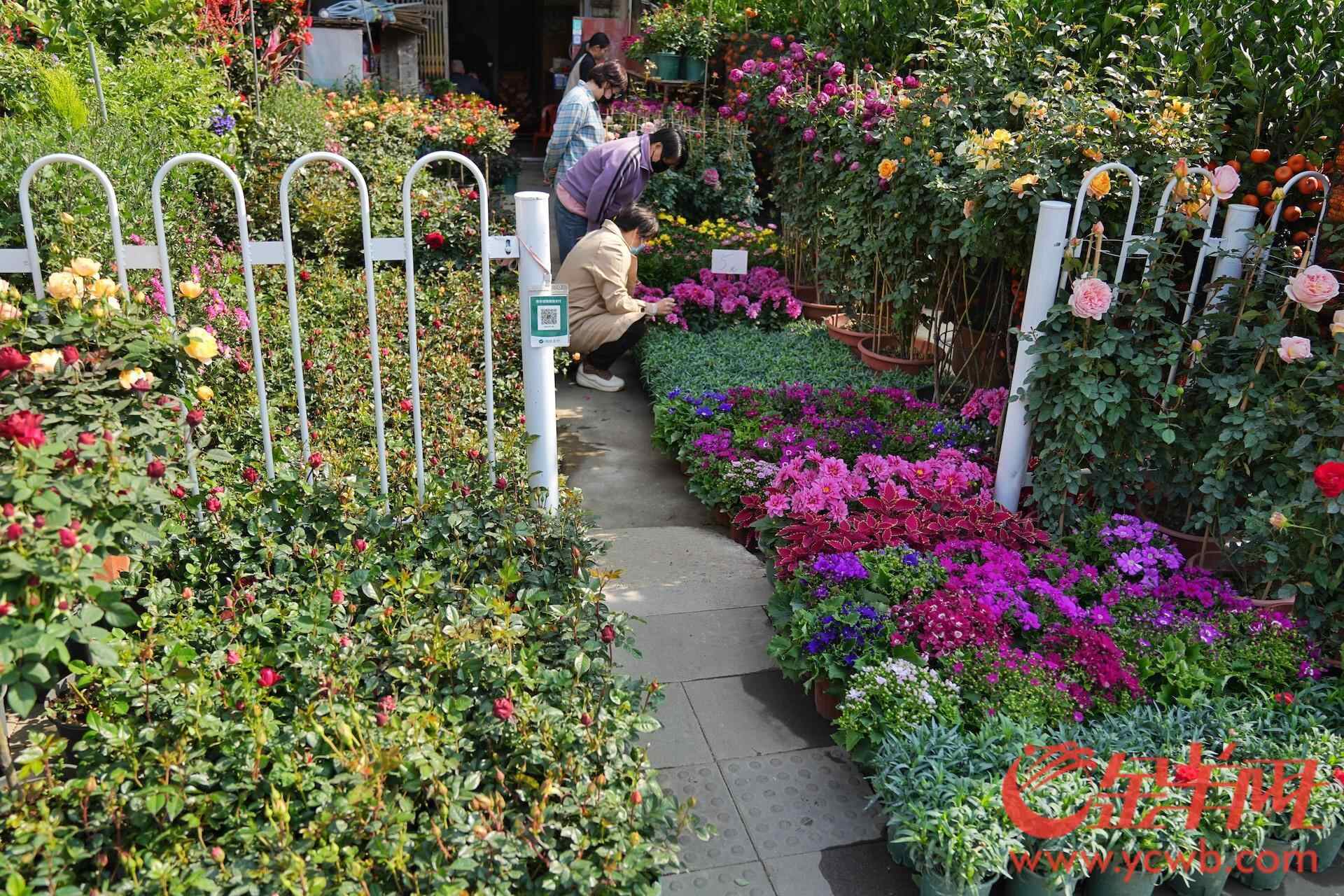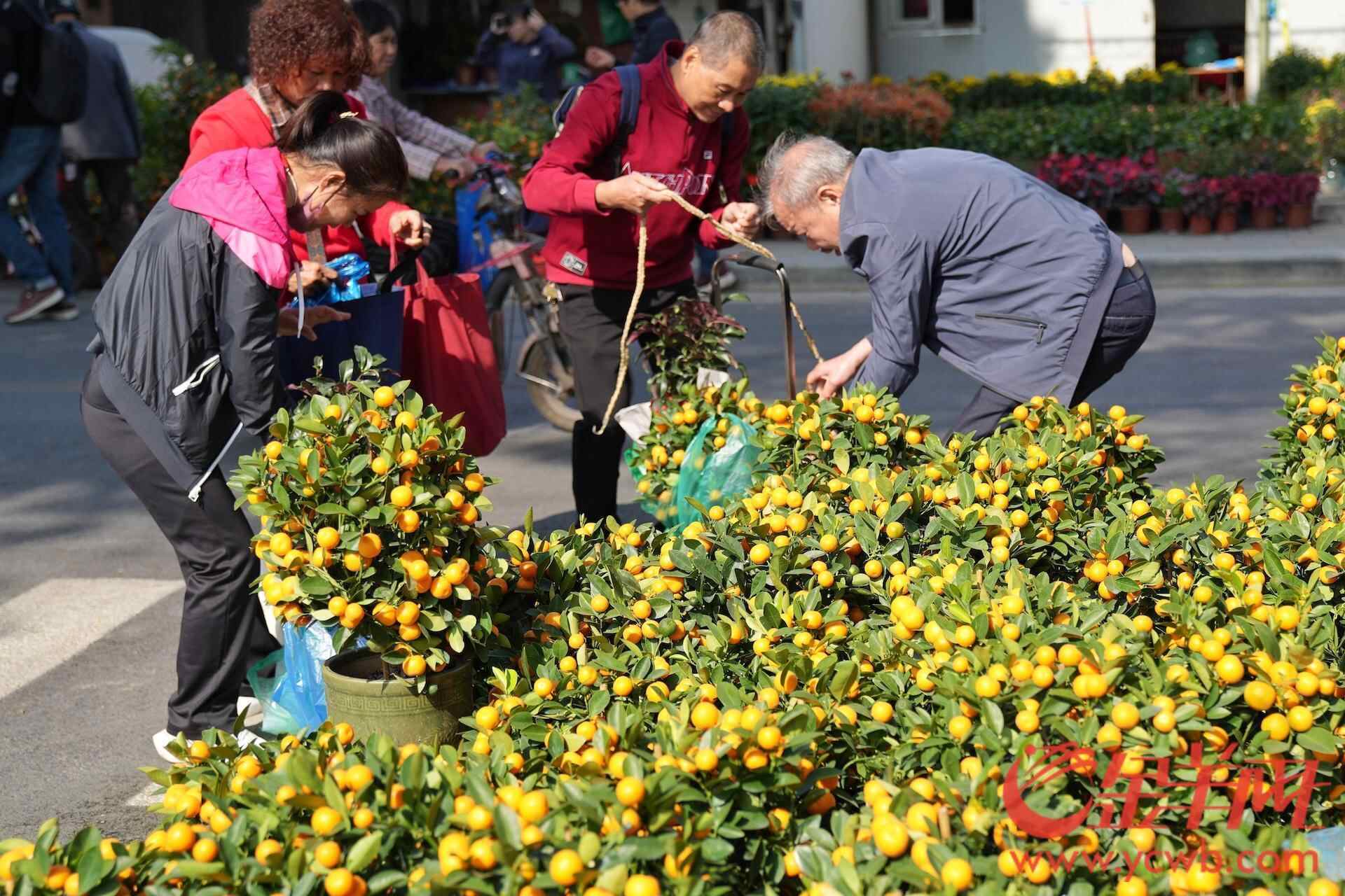 蝴蝶兰、金桔、五代同堂果、盆栽菊、冬青……走进岭南花卉市场,道路两侧的店铺已摆满多个品类年宵花。