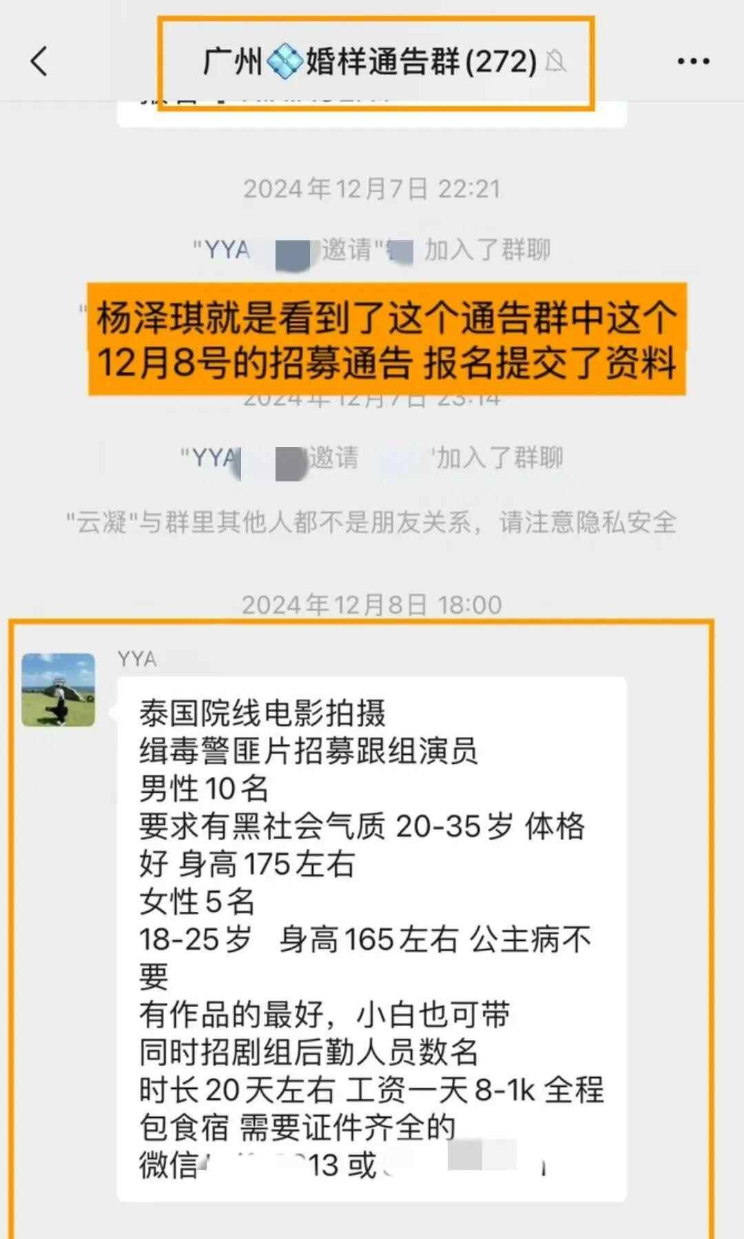 杨泽琪的微信聊天记录显示,2024年12月8日,某“婚样通告群”发布了一则“某泰国院线电影剧组招募演员”的通知。杨泽琪经过视频试戏后,被告知面试通过,需要在2024年12月20日到达泰国曼谷。