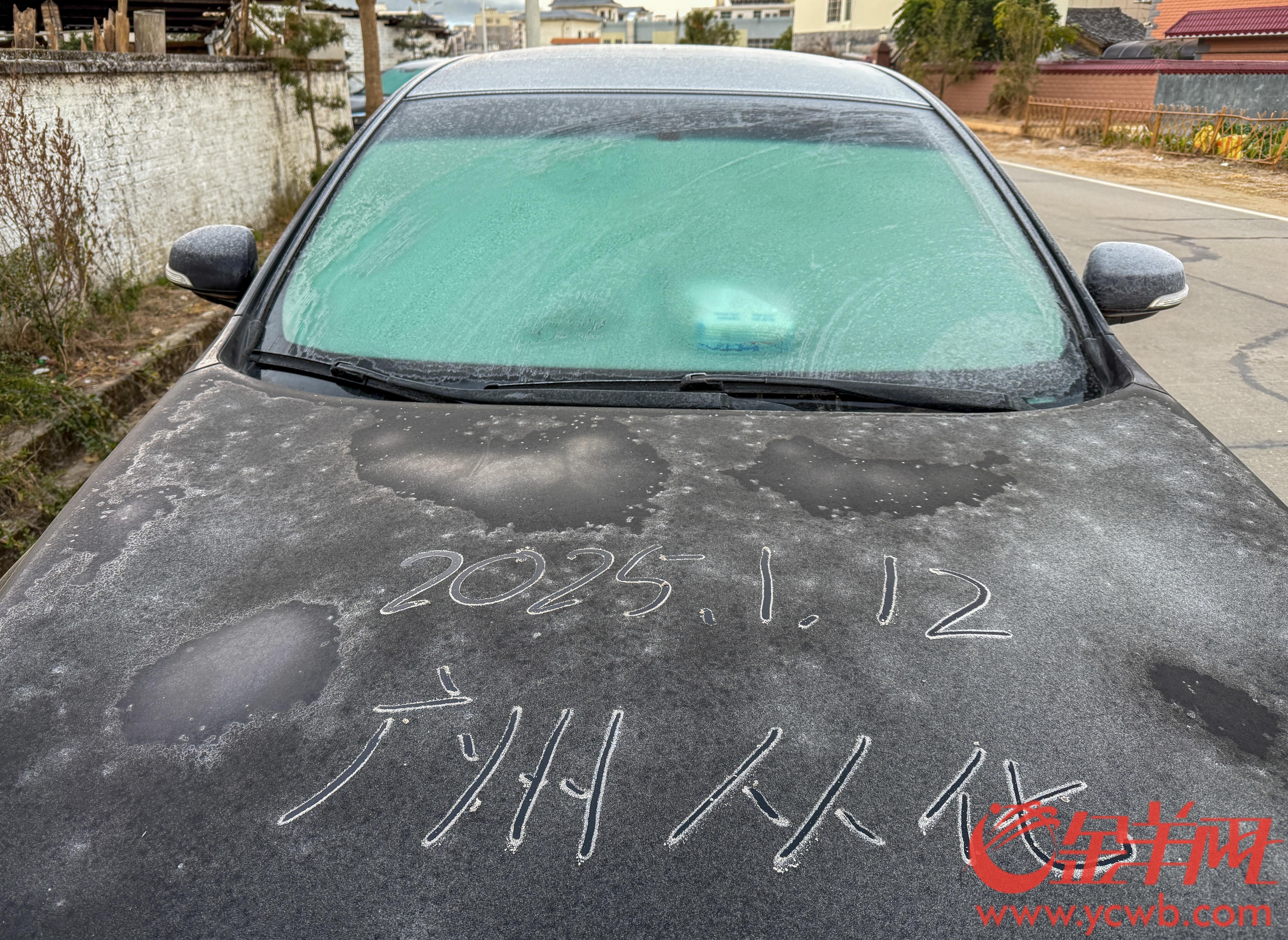 停放在吕田镇的汽车,12日早晨普遍车身披霜,有的汽车车身的霜较厚,可以在车身书写文字。