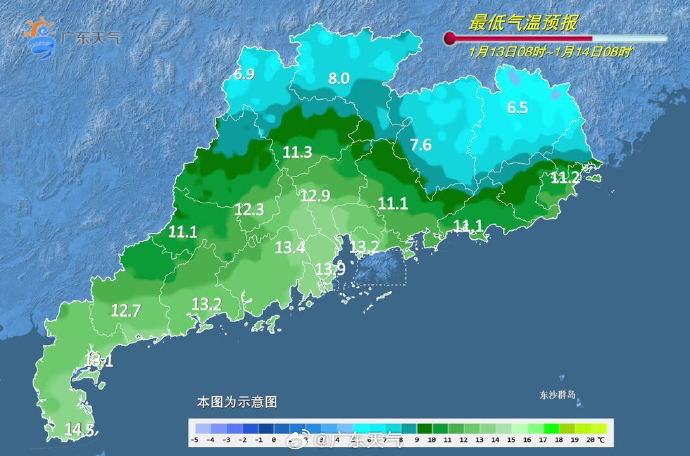 13日,南部市县晴转多云,其余市县晴间多云。最低气温:粤北市县0℃~3℃,高寒山区-4℃~0℃,有冰冻和霜冻,南部沿海市县8℃~11℃,其余市县4℃~8℃。