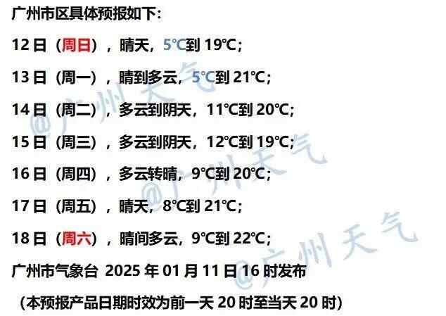 据@广东天气,预计1月14日-15日,广东大部云量增多,气温回升,其中西部市县有分散小雨,昼夜温差变小,最低气温明显回升。14日夜间到16日,新的一股弱冷空气影响广东,各地日平均气温将下降3℃~5℃,过程最低气温将出现在17日早晨前后。