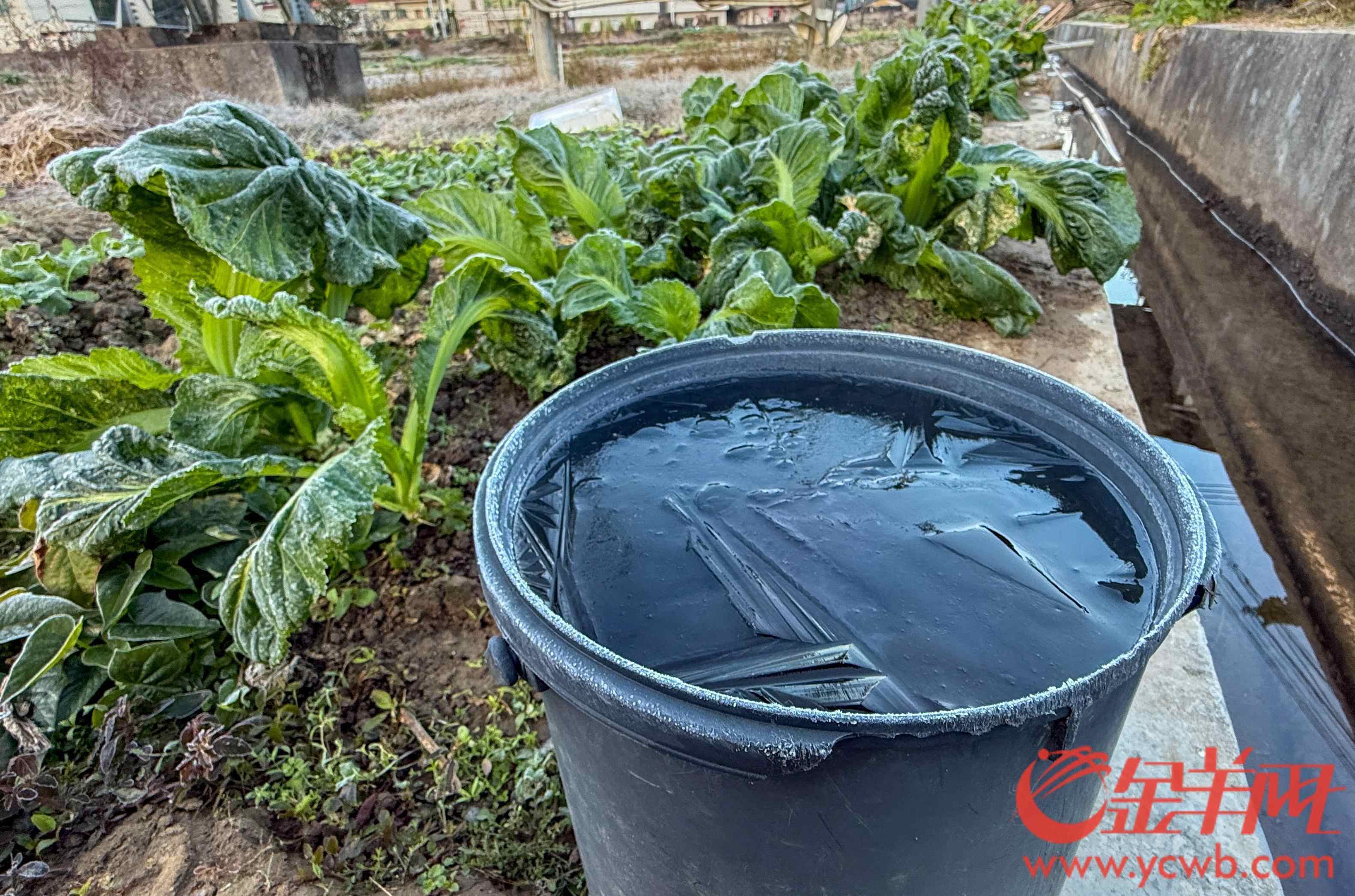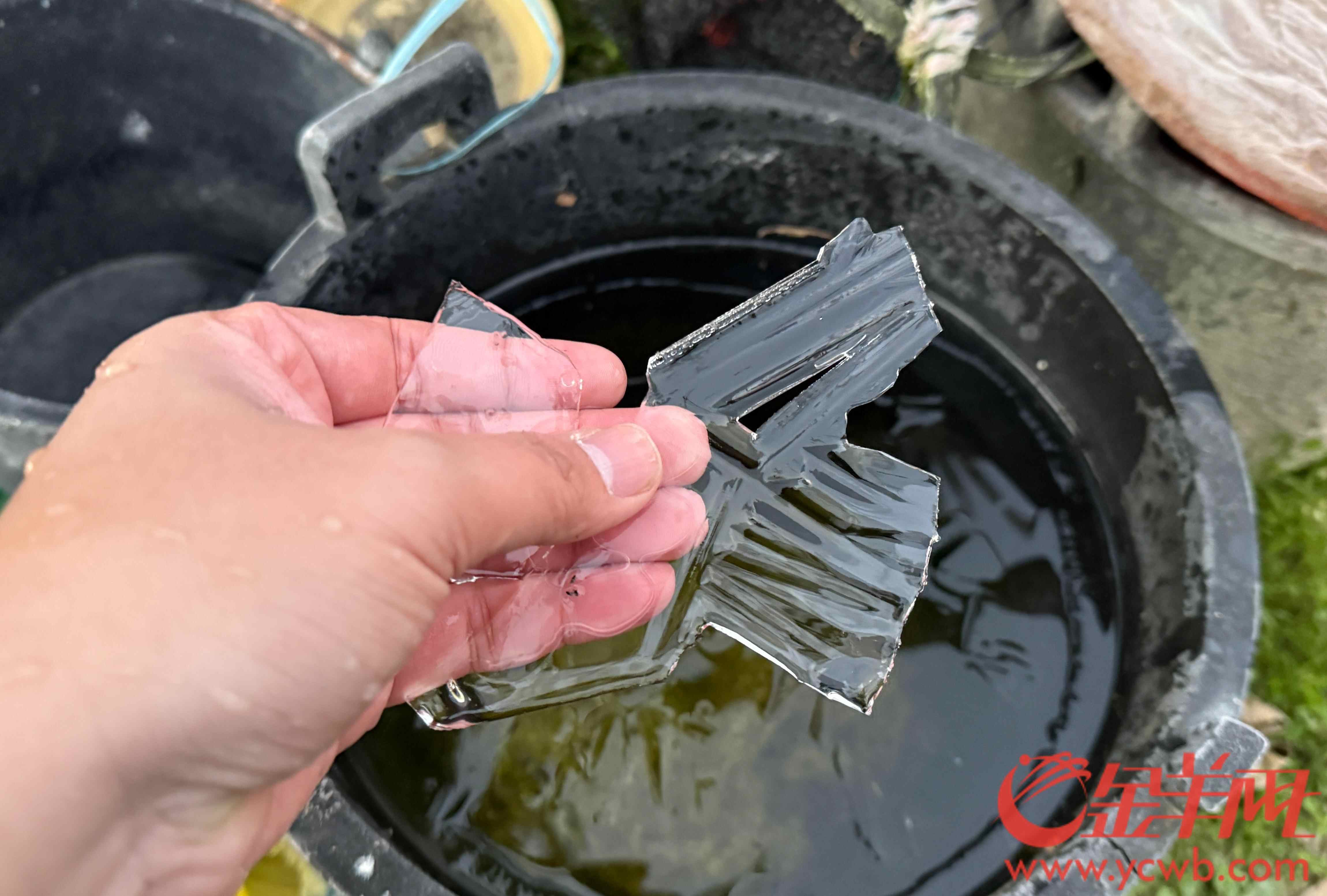 摆放在菜地装有水的水桶,普遍出现结冰;有的水桶冰层较厚,用手拍也拍不烂;有的水桶冰层在拍烂后,可以捡出如同玻璃般的冰块。