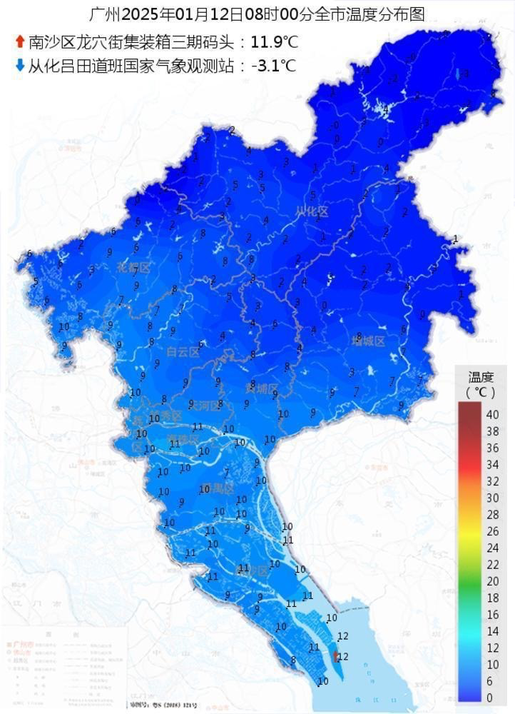 羊城晚报记者1月12日6时许沿大广高速驾车到达吕田镇时,车内温度计显示外部气温-3℃。结合广州市气象台根据广州各地自动气象站所生成的广州观测实况,吕田镇在12日8时前持续有自动气象站记录到低于-3℃的实时气温。