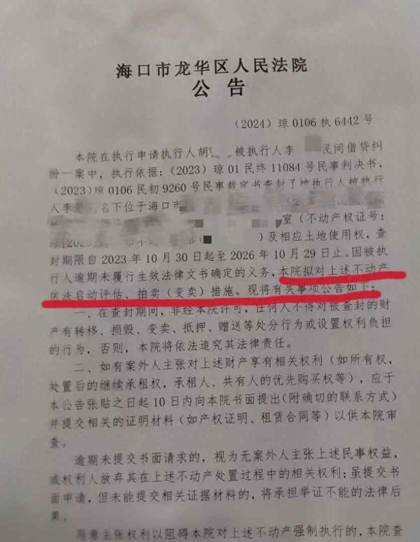 近日,家住北京的李先生遭遇了一场突如其来的“房产风波”。他在社交媒体上发文称,自己于2016年在海南省海口市购置了一处房产,一直空着没人住。2025年1月5日他收到法院的公告告知该房产“将被执行法拍”。