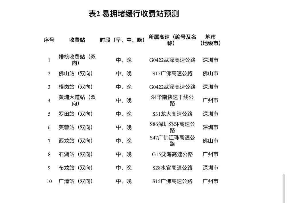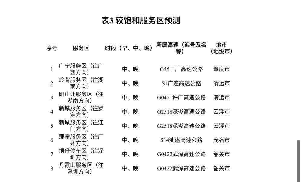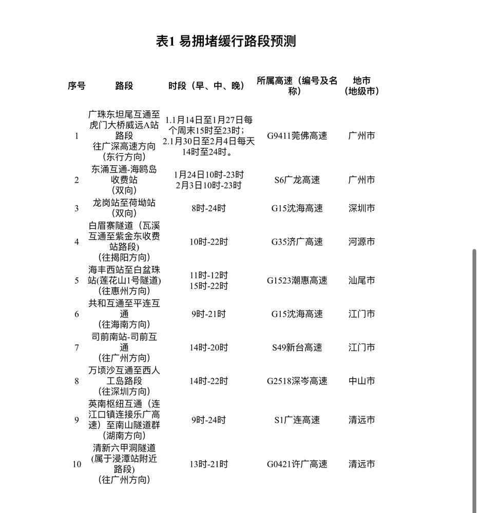 经与省公安厅交管局联合研判,今年广东春运期间较为拥堵的路段、收费站、车流较饱和服务区,以及充电设施利用率高的服务区详见下表。广东交通运输部门将提前研判,周密部署,全力保障高速公路运行畅通有序。