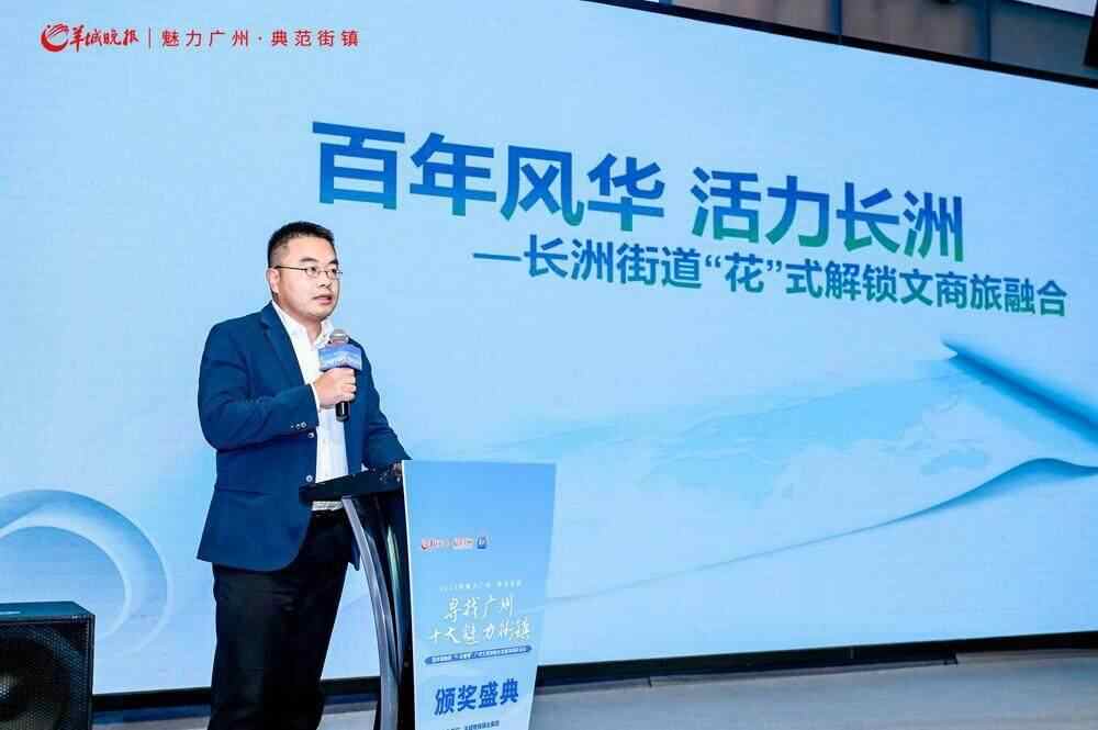 广州市黄埔区长洲街道获典范街镇·广州十大魅力街镇奖项。活动现场,长洲街道党工委书记王洋作为广州镇街代表,发表了题为《百年风华 活力长洲》的演讲推介,从城区品质筑基、历史文化铸魂、文旅融合焕彩三方面,介绍了长洲街如何“花”式解锁文商旅融合,全面提升街道的综合竞争力。