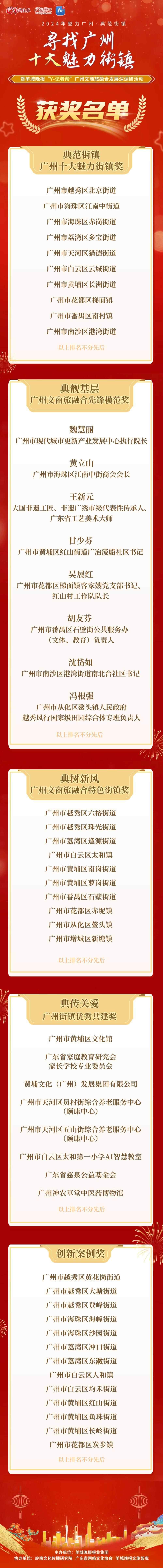活动自2024年10月正式发起,历时近3个月,经过号召11区各街镇参与报名、专家组调研团走进街镇调研、全网投票、专家评选等环节,最终评选5个类别,共49个奖项。其中,10个“典范街镇·广州十大魅力街镇奖”,8个“典靓基层·广州文商旅融合先锋模范奖”,10个“典树新风·广州文商旅融合特色街镇奖”,8个“典传关爱·广州街镇优秀共建奖”,13个“创新案例奖”。