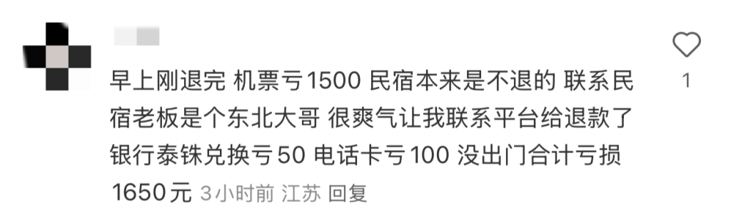 1月13日,有网友在社交平台相关话题下留言称自己早上刚退完票,机票亏1500元、外币兑换亏50元、电话卡亏100元,“没出门合计亏损1650元。”