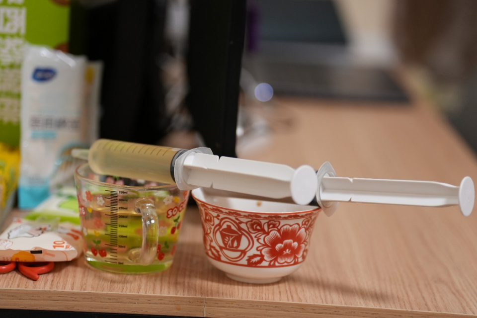 蔡磊每天要靠营养液和藕粉将药物服下。新京报记者 李相慧 摄