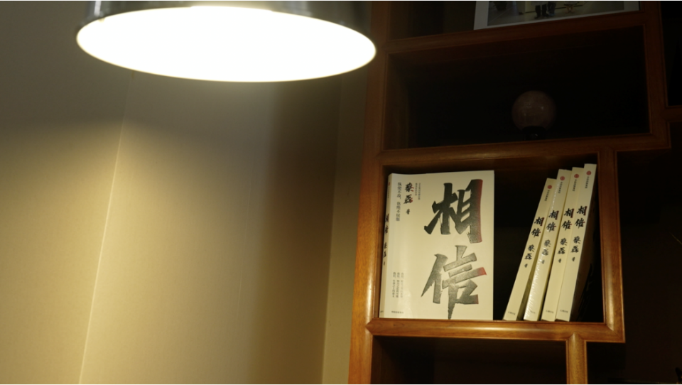 蔡磊家中客厅放置着他的自传《相信》。新京报记者 李相慧 摄