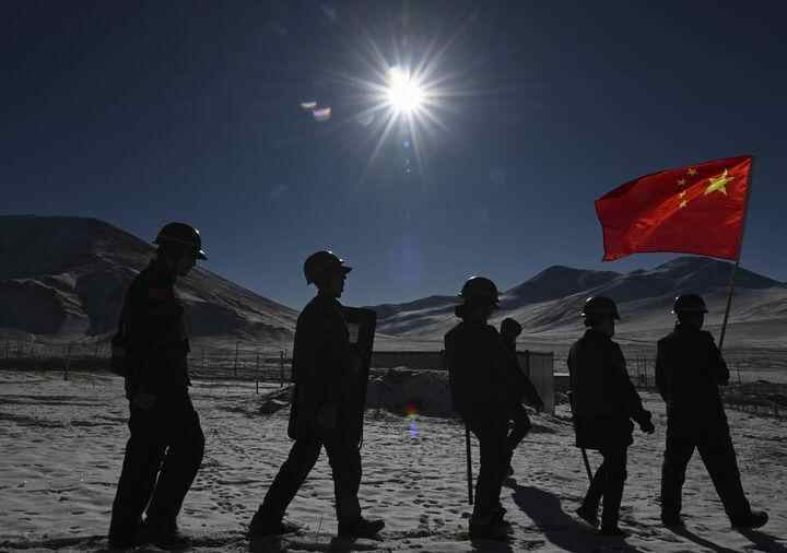 阳光直射,让人难以睁开眼。虽是中午,气温却接近零下20摄氏度。沿途,没有一棵树,远处仅有牦牛在雪原上觅食。路旁就是沿着界碑设立的边境管控设施。国与国的界限,如此具体可感。