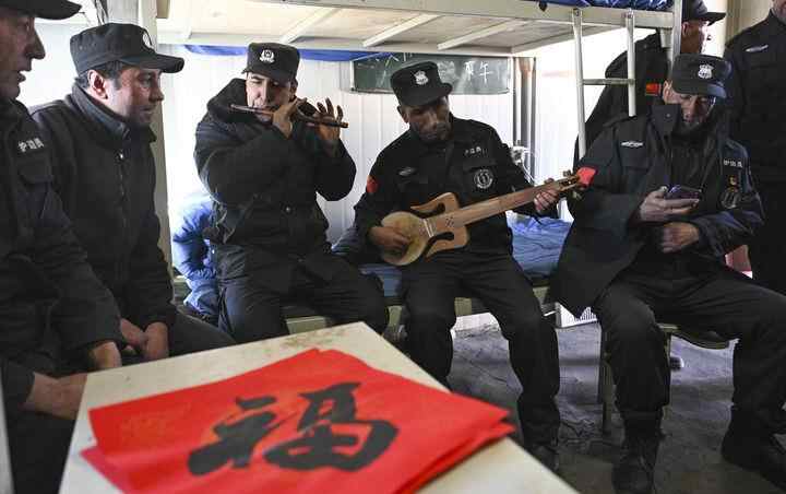 1月9日,护边员嘎达依与同伴一起吹奏乐曲《花儿为什么这样红》。新华每日电讯记者胡虎虎摄