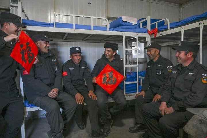 1月9日,多来提曼·开米克(右三)提前祝福本村护边员新春快乐。新华每日电讯记者 陈朔 摄