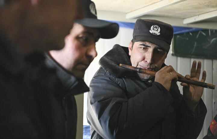 1月9日,护边员嘎达依在宿舍休息时吹奏乐曲。新华每日电讯记者胡虎虎摄