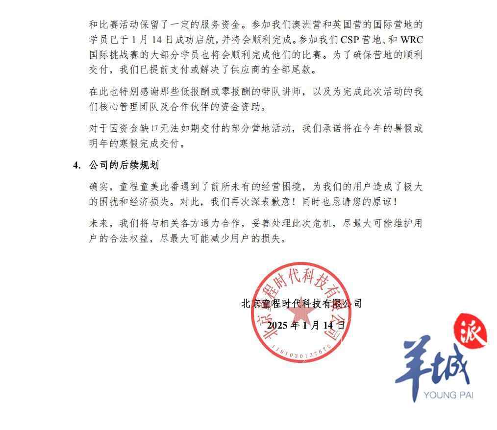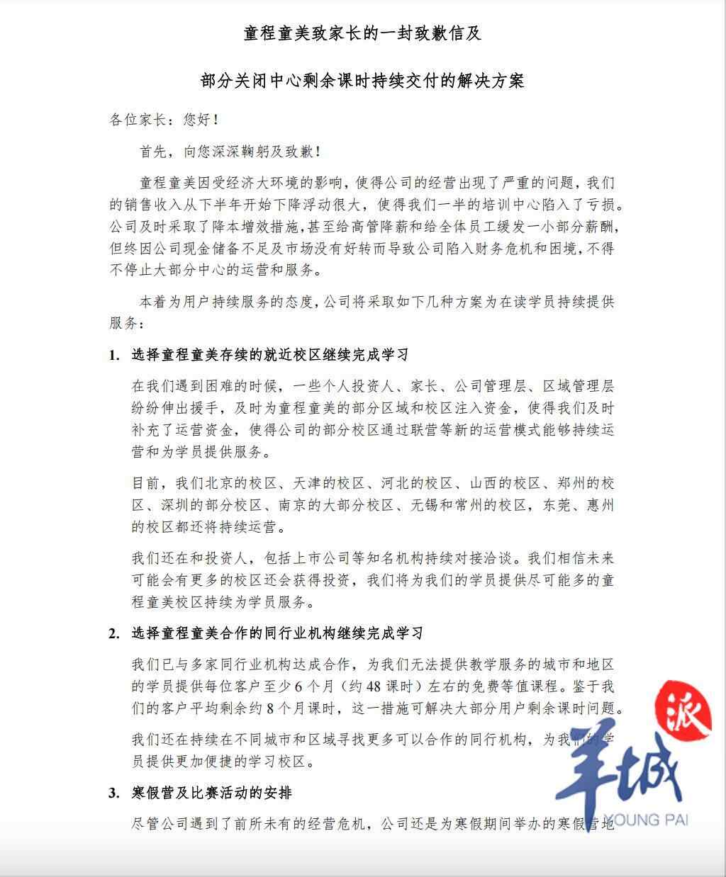 1月14日下午,疑似童程童美致家长的一封信在网络传出,其中提到,位于北京、天津、河北、山西、郑州、无锡、常州、东莞、惠州、深圳、南京的部分校区还将持续运营,至于无法提供教学的城市和地区,童程童美方表示已与多家同行业机构达成合作,为每位客户提供至少6个月(约48课时)左右的免费等值课程,并在持续寻找更多合作机构。记者注意到,广佛门店不在继续营业范围。