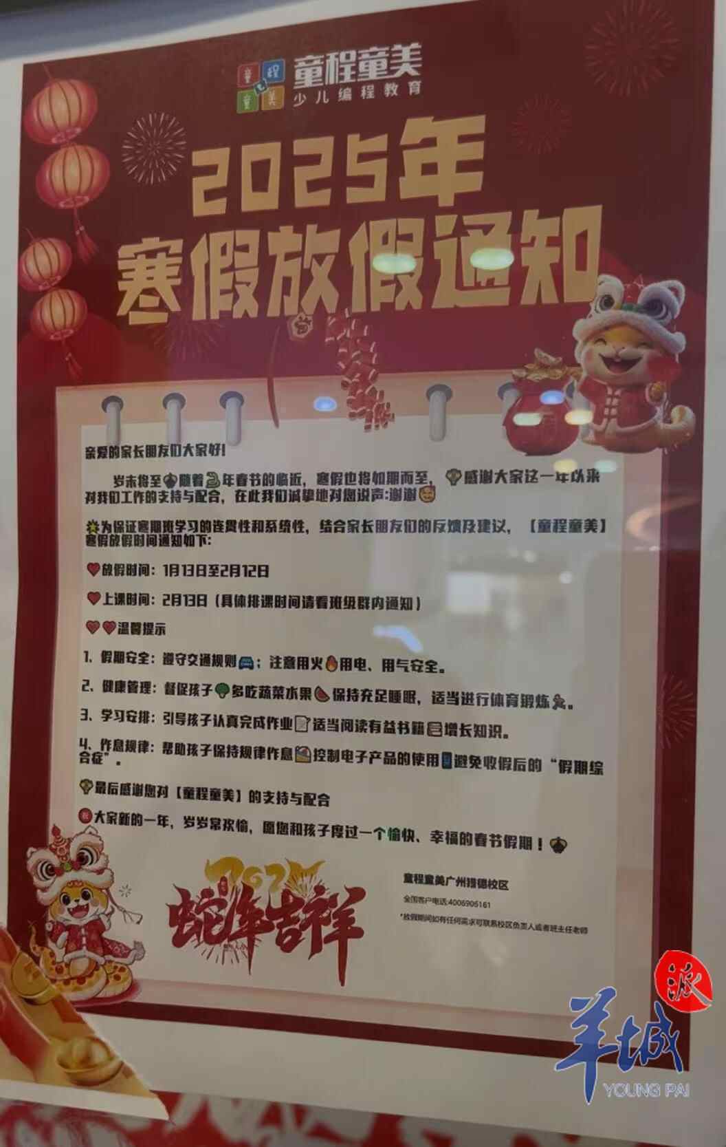 1月14日下午,记者来到童程童美猎德校区,发现大门紧锁,门上贴有一则放假通知,上面写道:放假时间为1月13日至2月12日,上课时间为2月13日,具体排课时间需要关注班级群内通知。有媒体走访了位于广州的其他校区,发现门店均未营业,且无法联系客服。