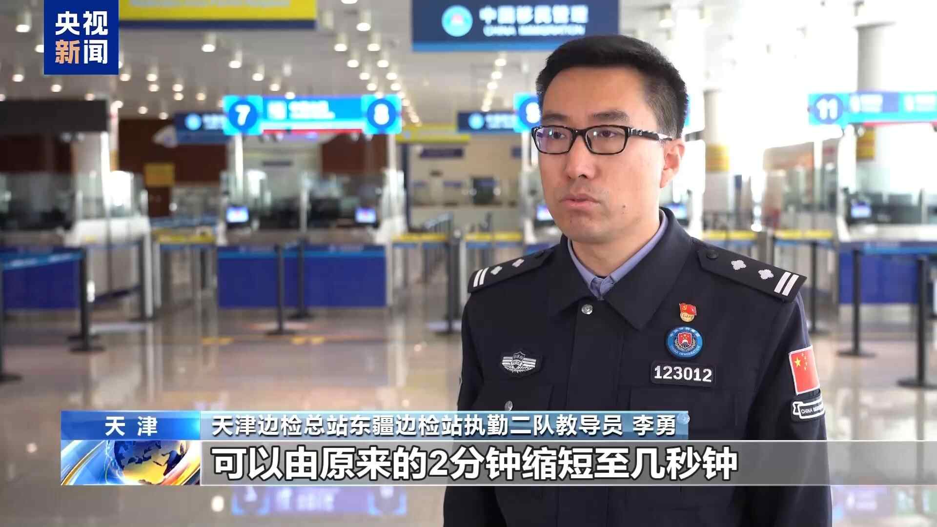 天津边检总站东疆边检站执勤二队教导员 李勇:我们为旅客提供免采指纹信息、免填外国人入境登记卡、免加盖验讫章的“三免”便利措施,人均通关时间从2分钟缩短至几秒钟。