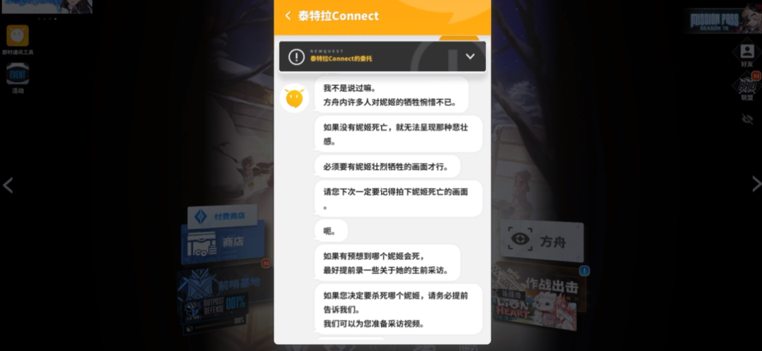 深度体现在多维呈现世界观设定上。主线我们感知到了由上位者传递的妮姬无尊严可言、被视为废铁的残酷定位,而支线与个人剧情进一步丰满了这种“全世界认知”的压迫感,比如有娱乐公司邀请指挥官拍摄妮姬的展示影片,毫不在意地表述着“如果没有死亡就无法呈现出那种悲壮感”、“预想到哪个妮姬死亡,最好提前录一些生前采访”。