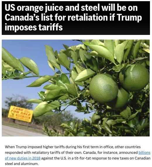 美联社此前援引一名加拿大高级官员的说法报道称,如果特朗普兑现其关税威胁,加方将考虑对美国的橙汁、盥洗用具和一些钢铁产品征收报复性关税。据悉,特朗普常住地佛罗里达州大量出产柑橘等产品。