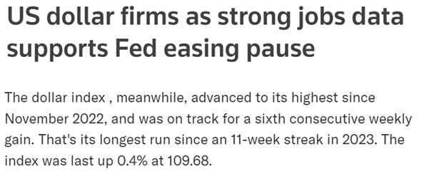 在上周最后一个交易日,美元指数涨至109.68点,达到2022年11月以来的最高水平。