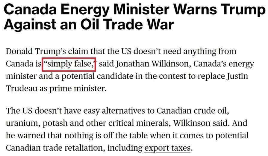 对此,加拿大自然资源部长威尔金森日前接受彭博社采访时表示,这种说法“完全是错误的”。对于加拿大的原油、铀、钾盐以及其他关键矿产,美国很难轻易找到替代品。