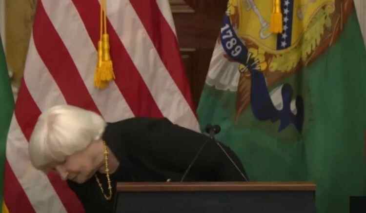 有人就此想起了两个多月前的一幕:彼时美国财政部长耶伦正在一场新闻发布会上批判特朗普的“孤立主义”政策。当有记者问耶伦能否详细说说“滥施关税”对美国经济乃至对美元地位会造成什么影响时,耶伦讲台前的美国财政部徽标突然掉到地上。