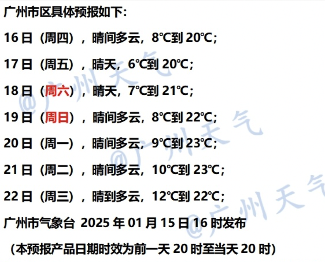 广州市气象台1月15日预计,受冷空气影响,15日夜间起广州气温将明显下降,16日至17日广州天晴干燥,昼夜温差大,早晚寒冷。预计17日早晨广州将出现冷空气影响过程的最低气温,届时广州北部2-4℃(山区0℃左右),中南部5-9℃。受冷空气影响,预计16日广州港区最大阵风6~8级。预计18日起冷空气影响减弱,广州维持晴朗干燥,气温缓慢回升。