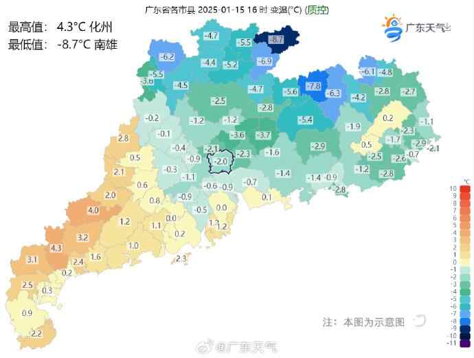 昨天(1月15日)白天,冷空气前锋已到达广东中北部。北部降温有多明显?通过16时变温实况可以看到,南雄同比14日降温近9℃。日落后,冷空气在广东“现出原形”。