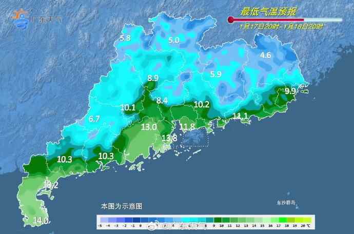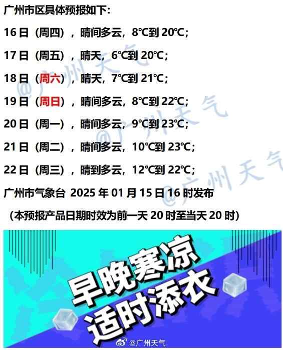 据@广东天气预计16日-17日,受冷空气影响,广东大部转晴间多云,森林火险风险等级高,粤北和珠三角北部有低于5℃的低温,其中高海拔山区零下4℃~0℃,有(冰)霜冻;18日天晴干燥,气温开始逐日回升,昼夜温差大,早晚寒冷,有(轻)雾;15日-18日,广东海面有东北风5~7级阵风8级。