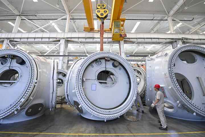 工人在位于山西转型综合改革示范区的太重集团新能源产业园区吊运风电装备(2024年5月30日摄)。新华社记者 杨晨光 摄