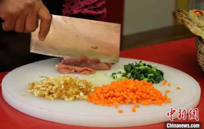 修水哨子的馅料十分丰富,包含五花肉、胡萝卜、虾米、油豆腐、大蒜等。熊锦阳 摄