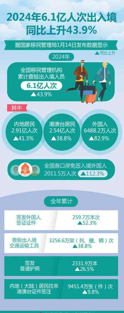 在2024年中国国际传播年度热词榜上,“中国游”一词名列前十。中国全面放宽优化免签政策,推出一系列便利外国人来华政策举措,“中国游”成为越来越多外国游客的优先选择。中国国家移民管理局最新数据显示,2024年,全国移民管理机构累计查验出入境人员6.1亿人次,同比上升43.9%;其中内地居民2.91亿人次、港澳台居民2.54亿人次、外国人6488.2万人次,同比分别上升41.3%、38.8%、82.9%。全国各口岸免签入境外国人2011.5万人次,同比上升112.3%。说走就走的“中国游”打开了世界了解中国的新窗口、新通道,向全球展现真实、多元和活力满满的中国形象。