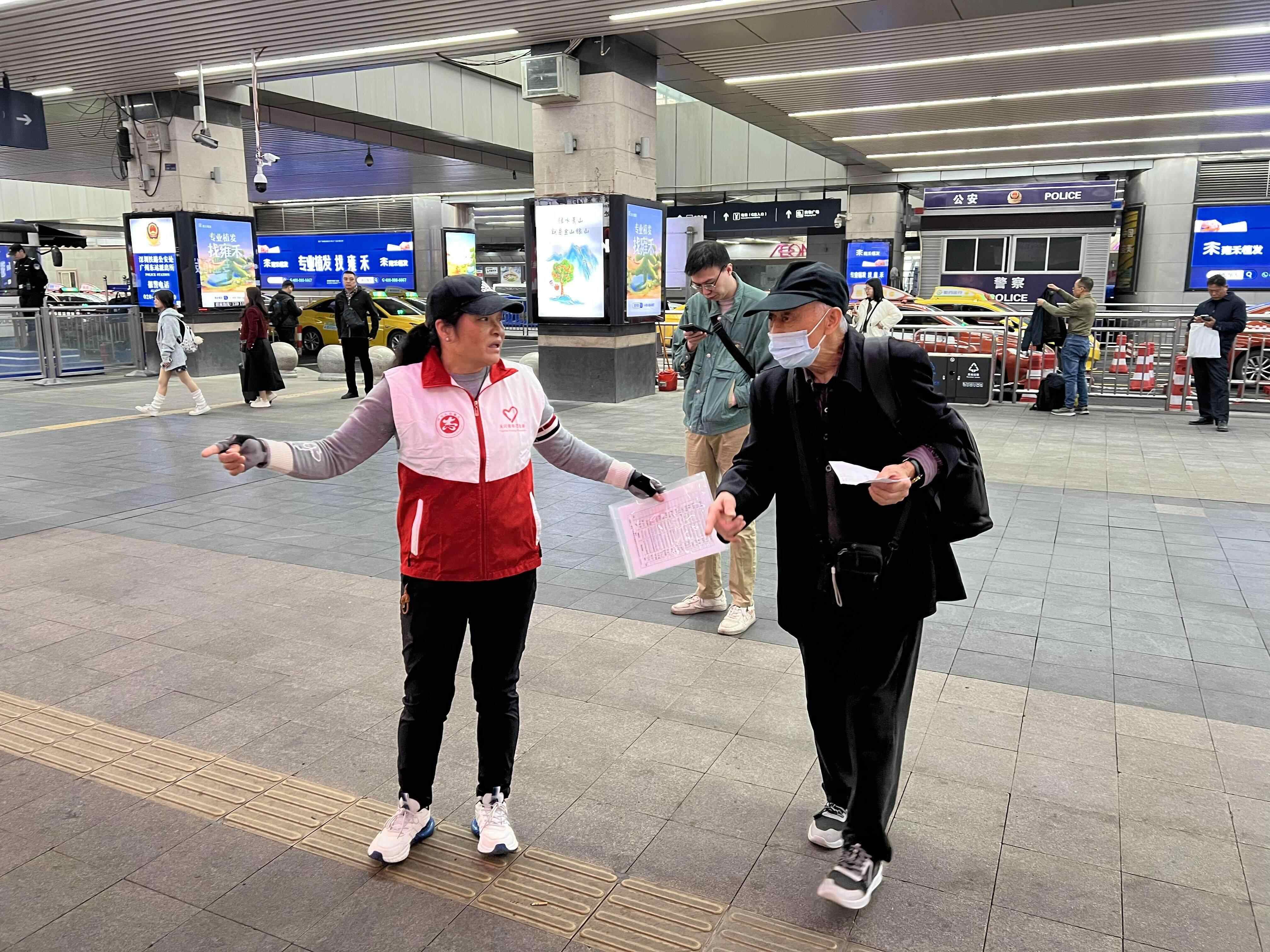 在信息咨询台前,志愿者们耐心解答旅客关于列车时刻、购票流程、乘车注意事项等各类问题,成为旅客出行的“小百科”。在车站的各个角落,志愿者化身乘车指引员,为旅客指引方向,帮助他们快速找到候车区域、检票口,确保每一位旅客都能按时顺利登车。在人流秩序维护中,志愿者们主动热情,他们穿梭在人群中,劝导旅客文明出行,维护车站的良好秩序,营造温馨和谐的乘车环境。
