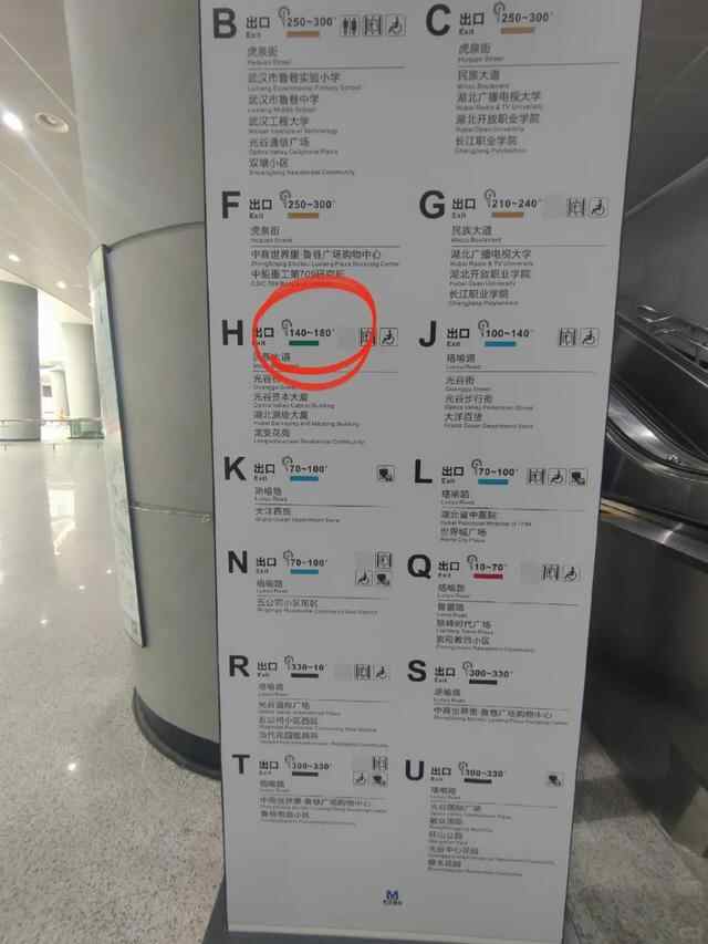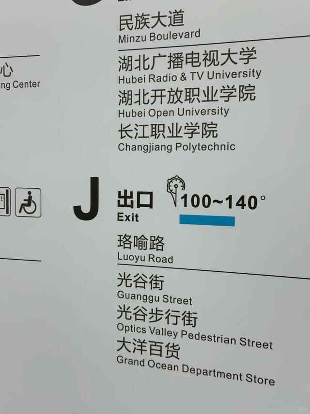 该站为何设计成按几何角度范围指引出站?“因为光谷广场站地理位置比较特殊一点,是个大圆圈,不方便指示朝左或者朝右走,所以目前是这样一个方式,通过360度的度数标识来指引乘客的方向。”该站工作人员解释说,“出入口的信息牌不仅标明了具体的度数范围,地面上和柱子上也都有清晰的标注,乘客只需要记住自己的目标出口对应的度数范围,跟随圆形指引走就能找到目的地。”