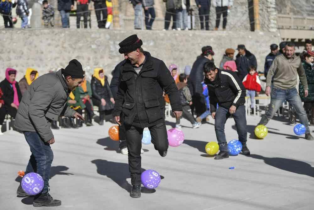 村民在大同乡阿依克日克村的小广场上参与踩气球互动游戏(1月7日摄)。
