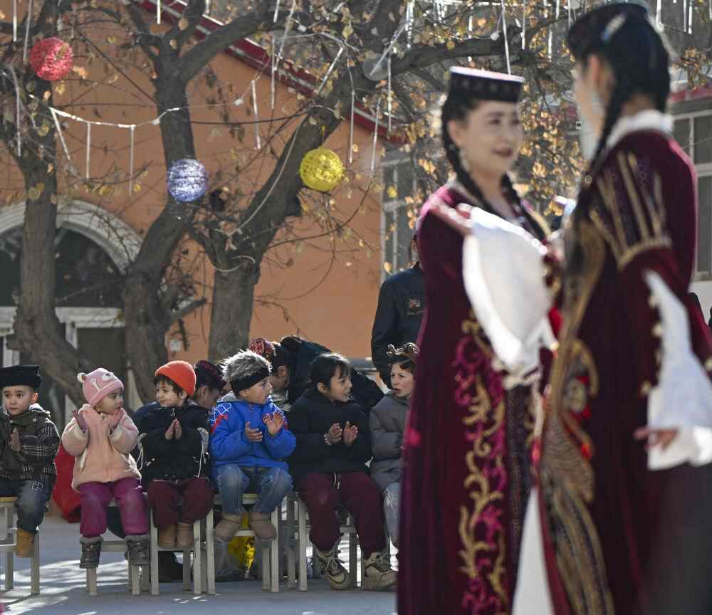 小朋友在大同乡阿依克日克村小广场上观看“群众村晚”演出(1月7日摄)。