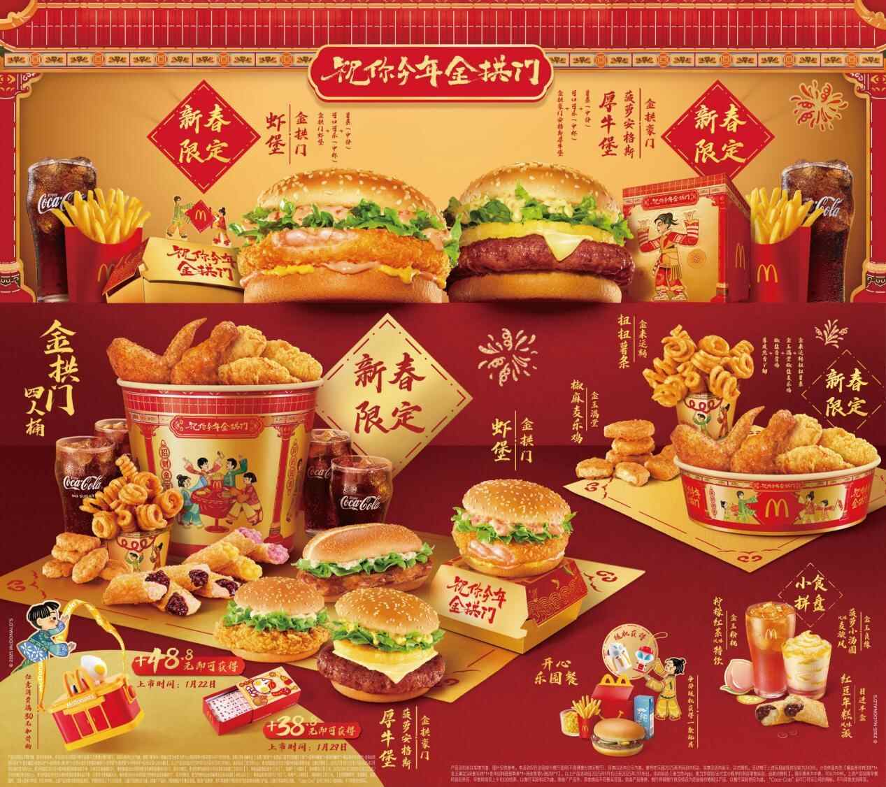 乙巳蛇年新春,麦当劳中国希望以“祝你今年金拱门”为主题,通过含“金”字的产品名字向所有消费者送上农历新春的美好祝福。活动期间,麦当劳中国推出多款含“金”字祝福的新春限定美味,包括甄选优质南美白虾制作的“金拱门虾堡”、厚实多汁的“金拱豪门菠萝安格斯厚牛堡”、麻辣鲜香的“金玉满堂椒麻麦乐鸡”、新年经典的“金来运转扭扭薯条”和“日进斗金红豆年糕风味派”、酸甜可口的“金玉良缘菠萝小汤圆风味麦旋风”,以及果香清新的“金运旺来金菠萝风味圆筒”和“金玉粉桃柠檬红茶风味特饮”。2月5日,还将上线 “胭脂妃子笑荔枝玫瑰风味麦旋风”,为开年返工带来甜蜜助力。