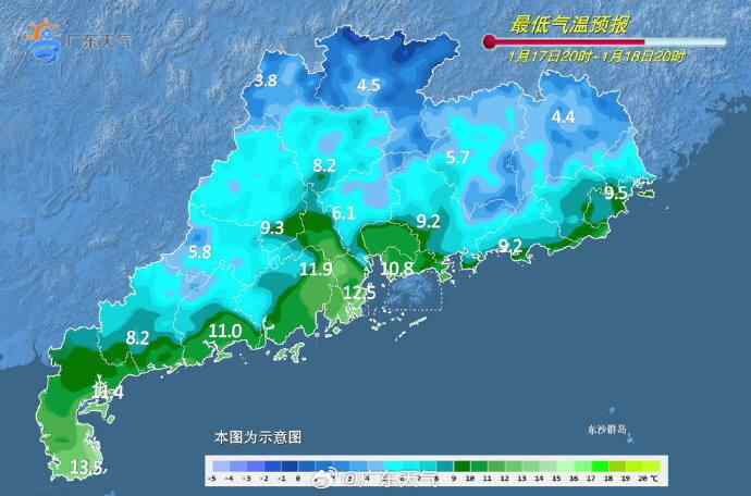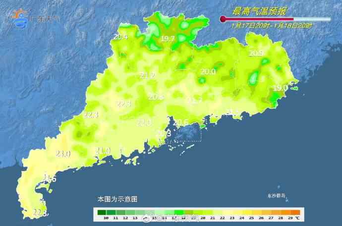 19日-20日,全省大部晴天,西部市县、北部湾海面、琼州海峡早晚有(轻)雾。最低气温:粤北市县6~9℃,南部市县12~14℃,其余市县9~11℃。