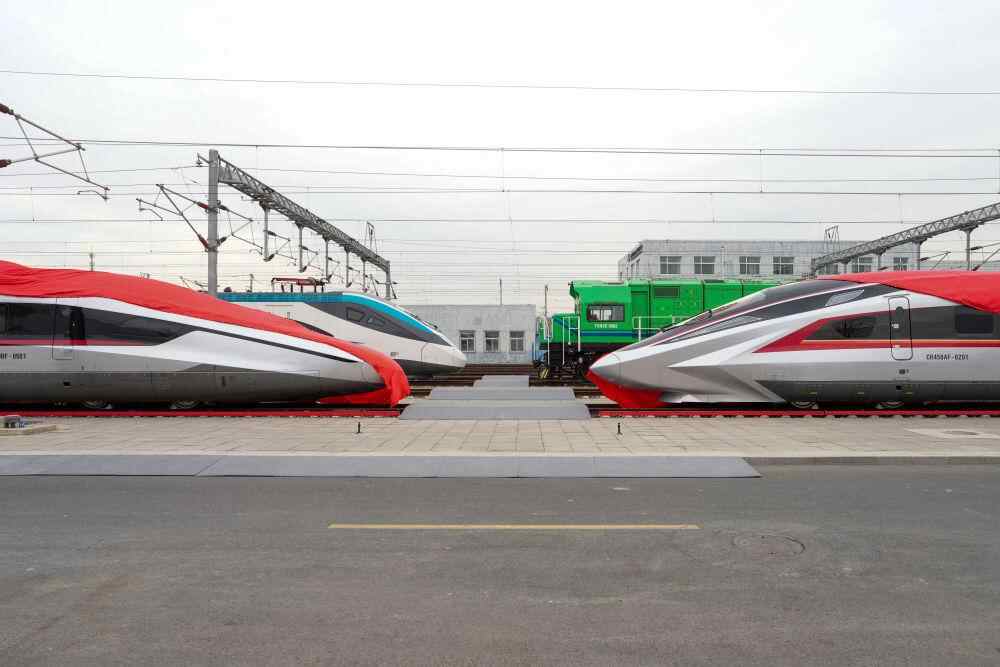 运营时速400公里的CR450AF(右)、CR450BF动车组样车在北京亮相(2024年12月29日摄)。 新华社记者 鞠焕宗 摄
