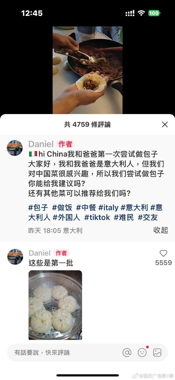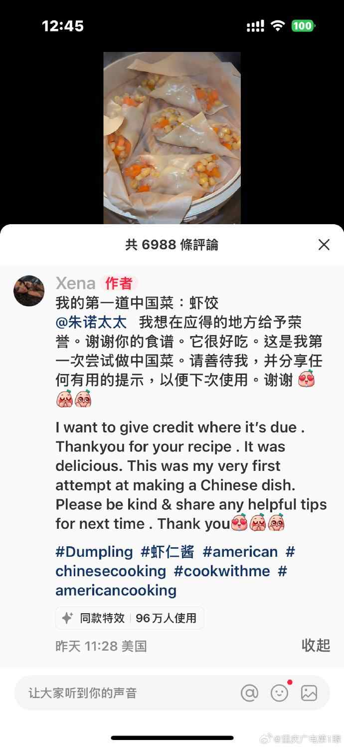 还有不少外国网友大秀厨艺,纷纷晒出自己的第一道中国菜,有虾饺、包子、番茄炒蛋、青椒炒肉等。评论区有中国网友留言表示,“比我厉害!”