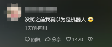 对此,有网友表示扮演得太像真的了,“没笑之前真以为是机器人”,“甚至觉得最后笑的那个是因为机器人表情太逼真了,都没怀疑是真人”。