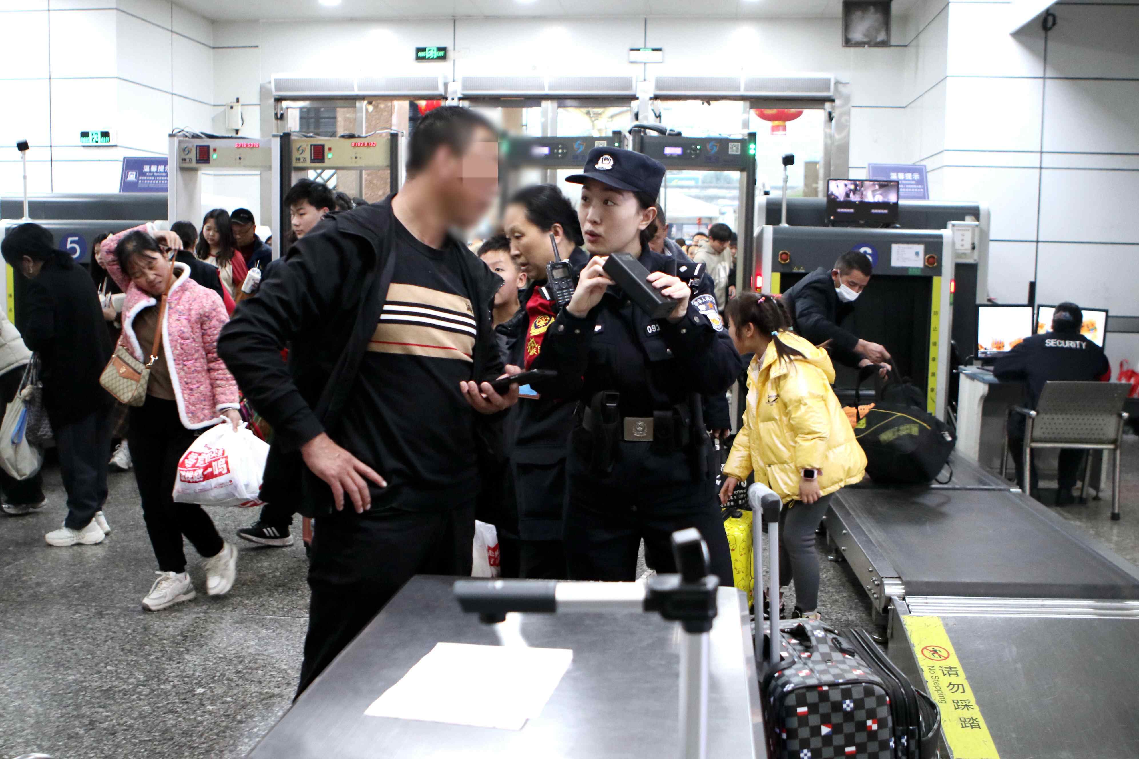 据悉,1月10日以来,广州南站派出所共查获易燃易爆品6413起,利器7686件,钝器87件,水果刀1954把,菜刀56把。为了旅客出行更通畅、温馨,广州南站派出所“南枫”护航队民警每日在客流高峰时段在安检区站岗执勤,为旅客答疑解惑。