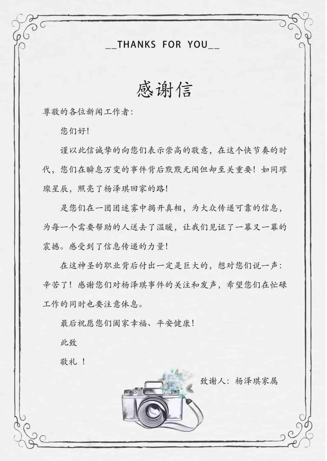 1月17日晚,羊城晚报记者收到牟女士发来的一封感谢信,该信署名为“杨泽琪家属”。在信中,杨泽琪家属对媒体给予的关注和发声表达了感谢。其中特别提到,感谢媒体为大众传递可靠的信息,为需要帮助的人送去了温暖。